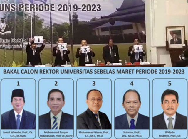 SOLO, HADILA – Lima orang kandidat Rektor Universitas Sebelas Maret (UNS) Surakarta, Prof Dr Jamal Wiwoho SH MHum, Prof Dr Muhammad Furqon MPd, Prf Muhammad Nizam ST, MT, PhD, Prof Drs Sutarno MSc, Prof Dr Widodo Muktiyo, Rabu (6/2/2019) pagi-siang, menyampaikan visi dan misi mereka menjelang pemilihan Rektor UNS periode 2019-2023.