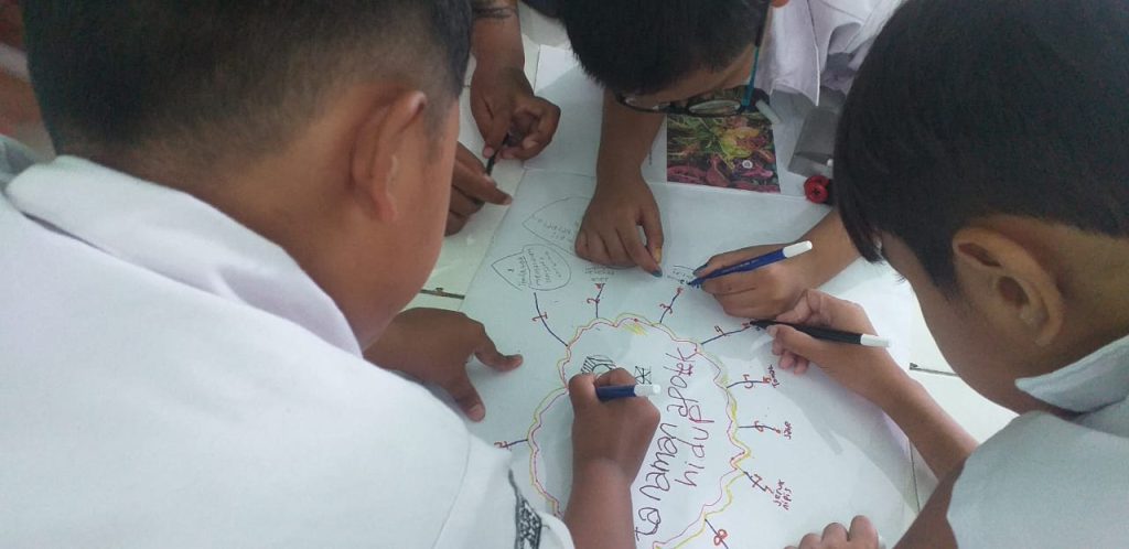Selanjutnya murid-murid mendapatkan penjelasan tentang pentingnya literasi, tahapan membuat mind mapping, sebagai salah satu produk hasil berliterasi.