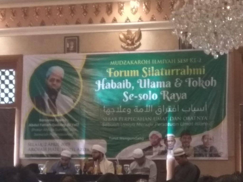 Hadila.co.id – Forum Silaturrahmi antara habaib, ulama dan tokoh di Solo Raya digelar di Hotel Horison Aziza, Kedung Lumbu, Pasar Kliwon, Solo, Jawa Tengah, Selasa (2/4/2019).