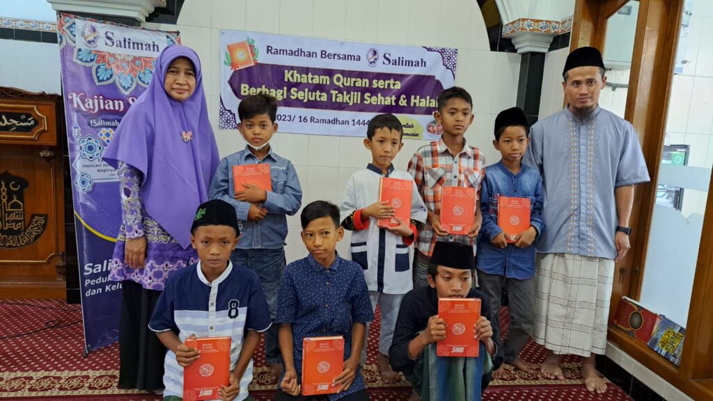 Solo – Pengurus Daerah Persaudaraan Muslimah (Salimah) Surakarta memberikan santunan, Al-Qur’an dan menu buka puasa bagi 59 anak yatim dan duafa. Santunan diberikan dalam rangkaian agenda Khataman Al-Qur’an, Berbagi Sejuta Takjil Sehat dan Halal yang digelar serentak di seluruh Indonesia, Jumat (6/4/2023), di masjid Darunnajah, Pundunggede, Solo.