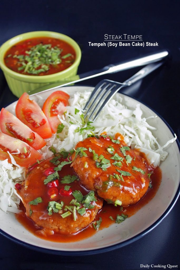 Siramkan saus ke permukaan steak tempe atau bisa disajikan ke dalam mangkok kecil.